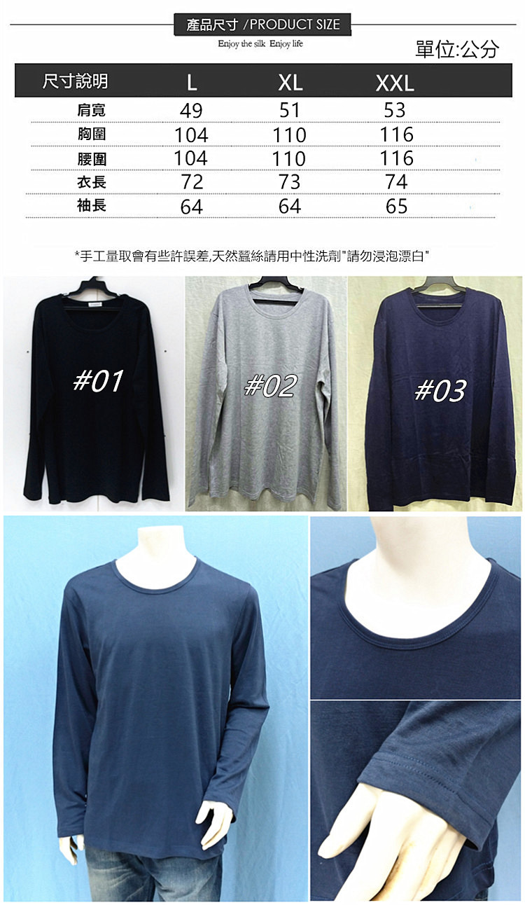 【特色說明】: !#01黑色:單面織加捻紗蠶絲,加捻手感會沙沙的,比較薄,耐穿!#02/#03是絹絲平紋布,觸感舒適!都很適合秋冬單穿居家休閒都合適~重要的是舒適好穿不會有汗臭味~讚啦!!