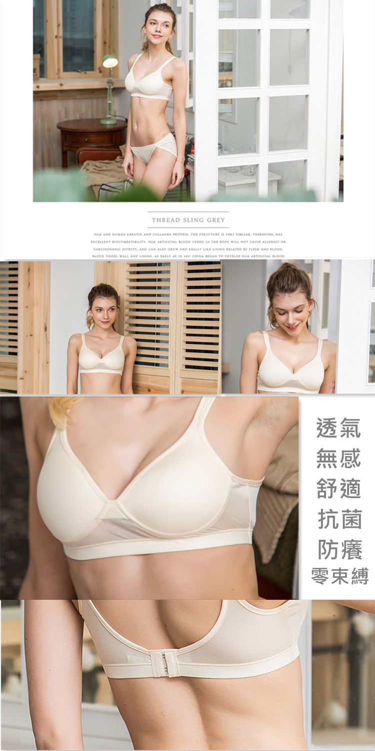 【特色說明】:寬肩帶,無鋼圈設計沒有束縛,罩杯很軟邊緣薄中間厚最厚處約1公分!運動瑜珈內搭都能托的住,輕輕的柔柔的好像感覺沒有穿卻又能挺起來,親愛的姊姊妹妹們,夏天來了;熱了;悶了;不要讓胸罩的痛癢一直困擾著您!換了吧,一起來享受天然蠶絲胸罩帶給您無與倫比的舒適感吧!呵~這個夏天輕鬆了解脫了. (如想要集中托高效果,請選集托款)